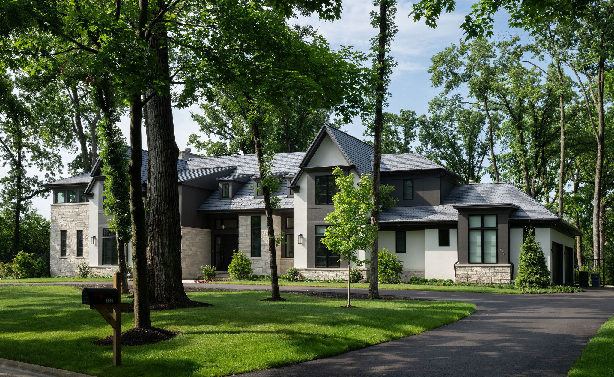 A custom Transitional estate in Northfield, IL, combining French-inspired architecture with modern minimalism for a refined, high-contrast aesthetic.