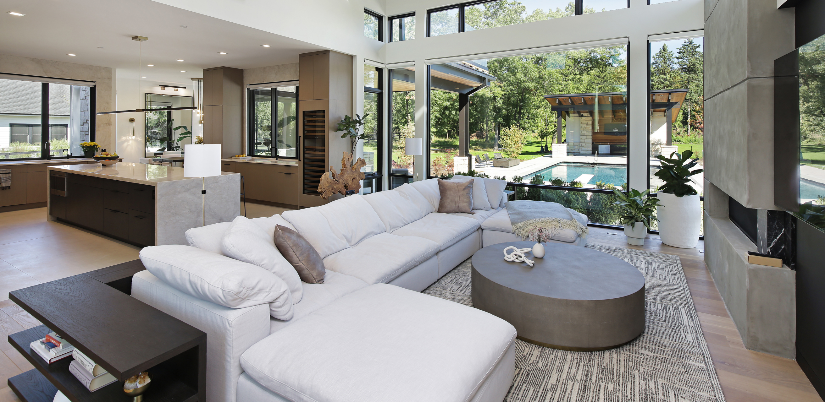 “This home is all about a balanced interaction between clean, sleek, modern forms and more organic natural wood and stone materials to create a refined, but warm, inviting, and comfortable feeling throughout. With deep roots in the horizontality of The Prairie School architecture, the exterior is a study in contrast between natural, organic and modern refinement, that is carried throughout the interior as well.