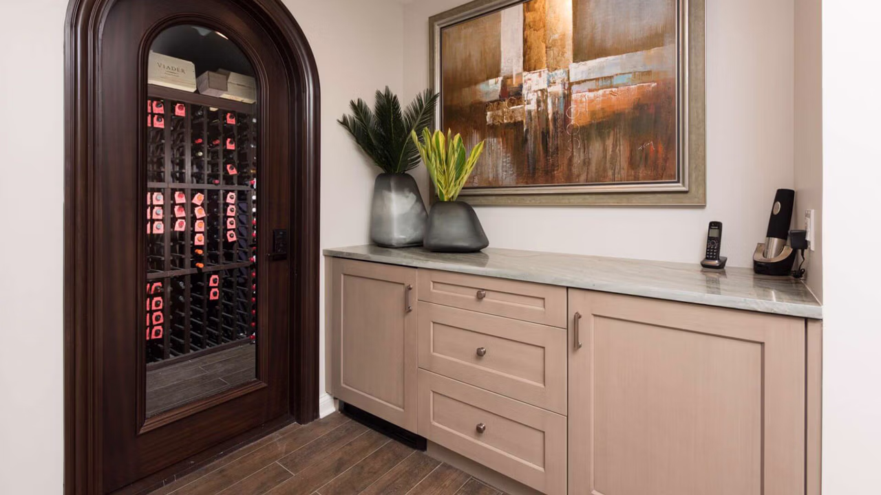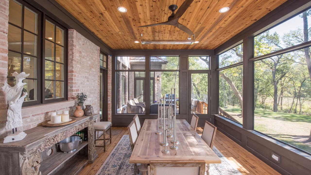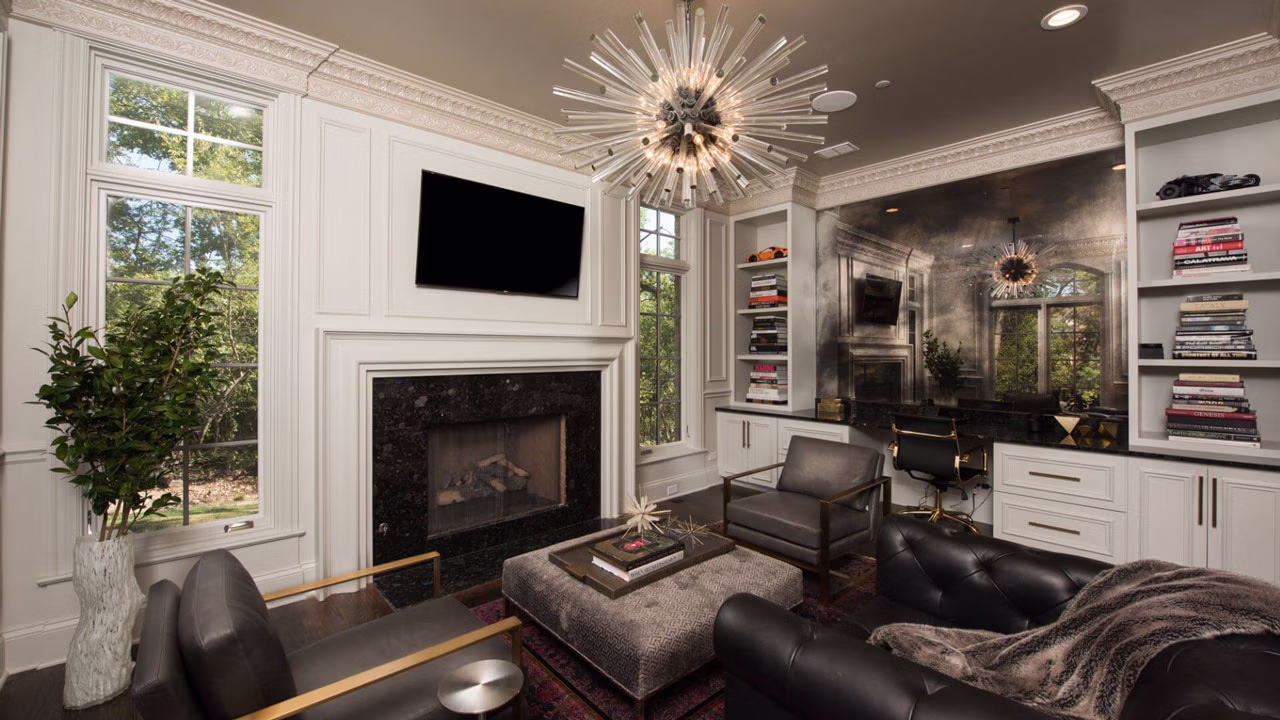 The home features an elegant exterior marked by subtle formality, secret doors and hidden rooms, and interiors crafted to showcase breathtaking wooded vistas—an exquisite retreat brought to life by A. Perry Homes.