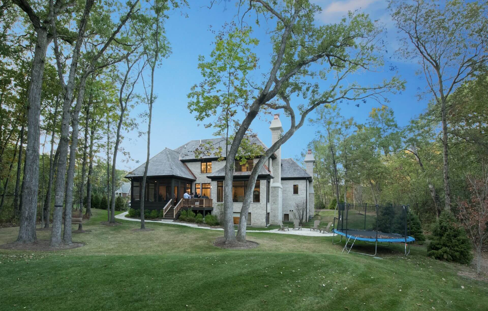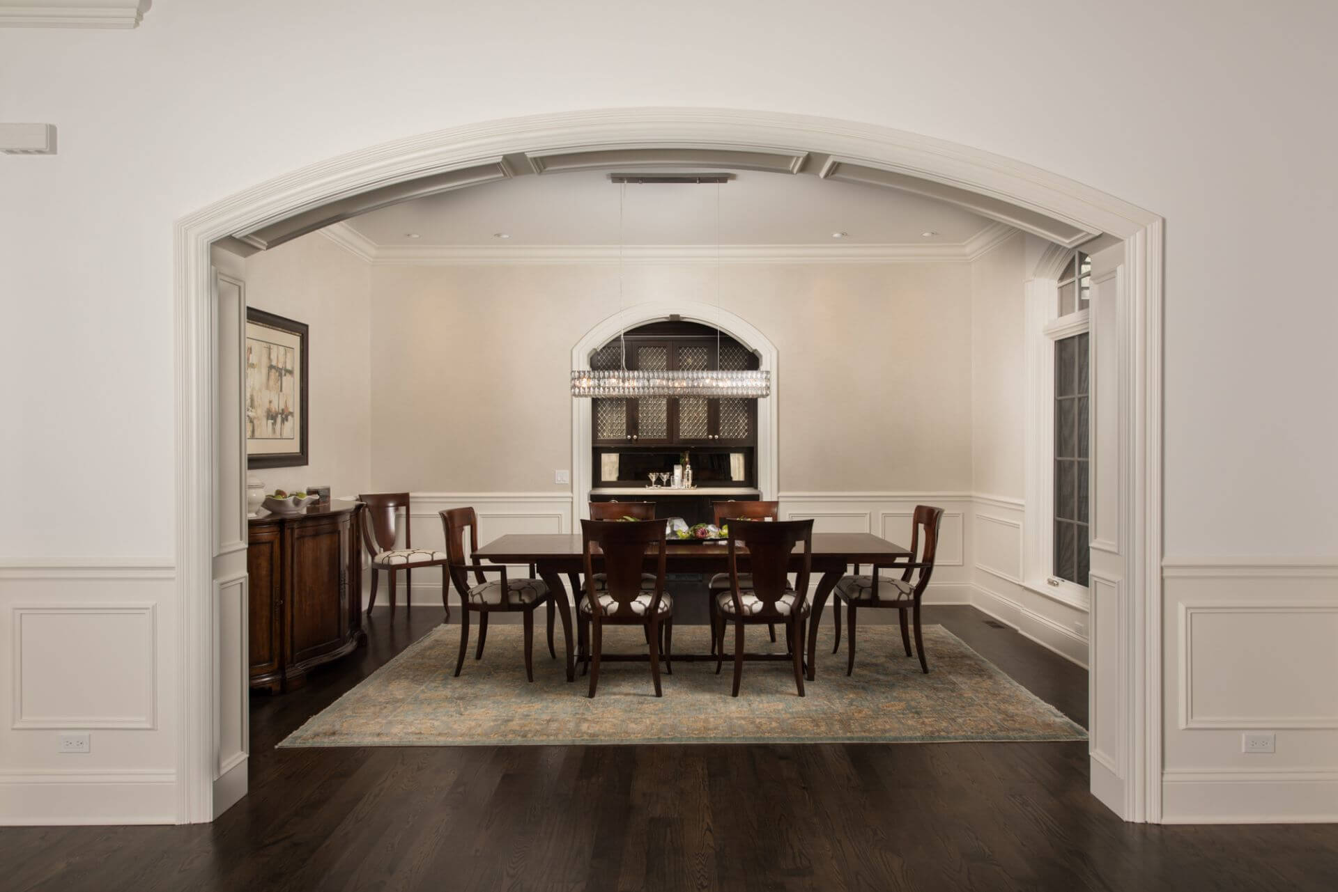 “Quiet, refined, and sophisticated, this exterior uses a carefully curated color palette and selective use of arched elements to provide visual accents throughout the facade. The floor plan, with its refined decor, focuses on maximizing views of the amazing wooded site while creating interior spaces that are beautiful in their own right. Customized trim and millwork detailing throughout adds a touch of formality to the public spaces, while retaining the sense of comfort and useability that is important for the day-to-day use of a family home.”